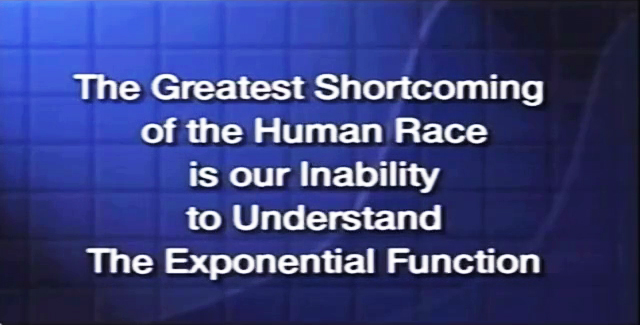 È un vero piacere essere qui, e avere la possibilità di incontrarvi, e parlare di alcuni dei problemi che stiamo affrontando. Alcuni di questi problemi sono locali, altri nazionali, altri globali, ma sono tutti collegati tra loro. Sono collegati dall’aritmetica, e l’aritmetica non è molto difficile, e quello che spero di fare è di riuscire a convincervi che il più grande fallimento della razza umana è la nostra incapacità di comprendere la funzione esponenziale.
