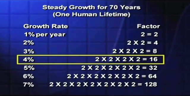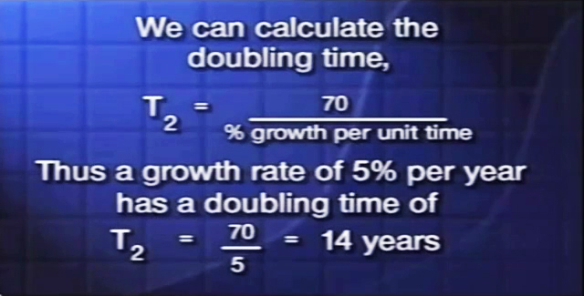 Se ci vuole un periodo di tempo fisso per crescere del 5%, ne consegue che ci vuole un periodo di tempo fisso più lungo per crescere del 100%. Quel tempo più lungo è chiamato tempo di raddoppio. Abbiamo bisogno di sapere come si calcola il tempo di raddoppio, ed è facile. Si prende il numero 70, lo si divide per la crescita percentuale per unità di tempo, e questo dà il tempo di raddoppio. Quindi il nostro esempio del 5% annuo, si divide il 5 nel 70, si scopre che la quantità crescente raddoppierà di dimensione ogni 14 anni. Ci si potrebbe chiedere, da dove deriva il 70? La risposta è, che è approssimativamente 100 moltiplicato per il logaritmo naturale di due. Per derivare il tempo necessario a triplicare, si userebbe il logaritmo naturale di tre. È tutto molto logico, ma non serve ricordare da dove deriva se si ricorda semplicemente il 70.