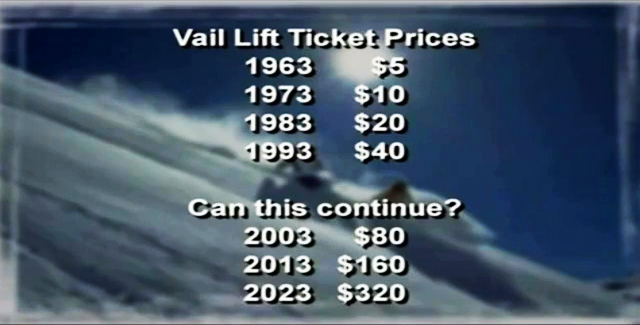 Cosa significa veramente 7%? Prendiamo un altro esempio dal Colorado. Il prezzo di uno skipass giornaliero per sciare a Vail è cresciuto di circa il 7% annuo da quando Vail ha aperto nel 1963. A quel tempo si pagava $5 per uno skipass giornaliero. Qual è il tempo di raddoppio crescendo del 7%? Dieci anni. Quindi qual era il prezzo dieci anni dopo, nel 1973 ($10)? Dieci anni dopo, nel 1983 ($20)? Dieci anni dopo, nel 1993 ($40)? E cosa dobbiamo aspettarci? Questo è ciò che significa 7%, la maggior parte delle persone non ne ha la più pallida idea.
