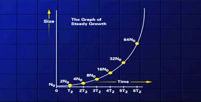 Osserviamo un grafico generico di qualcosa in crescita costante. Dopo un raddoppio la quantità in crescita raggiunge il doppio della dimensione iniziale, due raddoppi e raggiunge quattro volte la dimensione iniziale. Poi va a 8, 16, 32, 64, 128, 256, 512. In appena dieci raddoppi è mille volte più grande dell’inizio. Si vede, se si prova a tracciare un grafico, un normale grafico su carta, che il grafico attraverserà il soffitto.