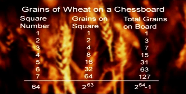 Facciamo un esempio per dimostrare i numeri enormi che si ottengono con un piccolo numero di raddoppi. La leggenda narra che il gioco degli scacchi sia stato inventato da un matematico che lavorava per un re. Il re era molto contento, disse, “Voglio premiarti”. E il matematico disse, “I miei bisogni sono modesti, per favore prendi la mia nuova scacchiera, e nel primo quadrato metti un chicco di grano, nel quadrato successivo raddoppialo e mettine due, nel quadrato successivo raddoppia i due e mettine quattro, continua a raddoppiare finché non avrai raddoppiato per ogni quadrato, quello sarà un pagamento adeguato”. Il re avrà pensato, “Questo sciocco, ero pronto a dargli una vera ricompensa, ha chiesto solo pochi chicchi di grano”. Vediamo cosa succede. Notiamo che ci sono otto chicchi di grano sul quarto quadrato, si ottiene questo numero, otto, moltiplicando tre due, è 2x2x2, è un 2 in meno del numero del quadrato. Ciò vale in ogni caso, quindi sull’ultimo quadrato si trova il numero di chicchi di grano moltiplicando due 63 volte. Osserviamo il modo in cui si calcolano i totali. Quando c’è un chicco di grano sul primo quadrato, il totale sulla scacchiera è uno. Aggiungiamo due chicchi di grano, per un totale di tre. Aggiungiamo quattro chicchi di grano, ora il totale è sette, sette è un chicco di grano meno di otto, è un chicco di grano meno di due moltiplicato tre volte. Quindici è un chicco di grano meno di due moltiplicato quattro volte. Si continua ogni volta, quando si finisce il numero totale di chicchi di grano sarà un chicco di grano in meno del numero che ottengo moltiplicando due 64 volte. La domanda è, di quanto grano si tratta? Un bel mucchio qui nello studio? Riempirebbe l’edificio? Coprirebbe la contea fino ad un altezza di due metri? Di quanto grano stiamo parlando? La risposta è, che è circa 400 volte il raccolto mondiale di grano del 1990. Sarebbe più grano di quanto sia mai stato raccolto nell’intera storia della terra. Come si ottiene un numero così grande? È stato semplice, abbiamo iniziato con un singolo chicco di grano, ma abbiamo lasciato che il numero crescesse costantemente fino a raddoppiare 63 volte.