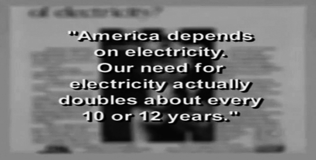 Ecco un annuncio dell’anno 1975 e chiedeva, “L’America potrebbe rimanere senza elettricità?”. L’America dipende dall’elettricità, il nostro fabbisogno di elettricità raddoppia ogni 10 o 12 anni, è un riflesso accurato di una storia molto lunga di crescita costante dell’industria elettrica in questo paese, una crescita al tasso di circa il 7% annuo, che determina un raddoppio ogni 10 anni. Con tutta quella storia di crescita, si aspettavano che la crescita sarebbe proseguita per sempre. Per fortuna si è fermata, non perché qualcuno abbia capito l’aritmetica, si è fermata per altri motivi, ma chiediamoci se – supponiamo – la crescita fosse continuata? Allora succederebbe come abbiamo appena visto sulla scacchiera. Nei dieci anni successivi alla pubblicazione di questo annuncio, in quel decennio, la quantità di energia elettrica che avremmo consumato in questo paese sarebbe stata maggiore del totale di tutta l’energia elettrica mai consumata nell’intera storia precedente di crescita costante in quel settore in questo paese.