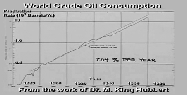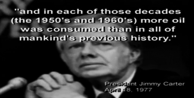 Avete compreso che qualcosa, del tutto accettabile come una crescita del 7% annuo, porta ad una conseguenza così incredibile? Che in soli 10 anni si consumebbe più del totale di tutto quello che è stato consumato in tutta la storia precedente? Questo è esattamente ciò a cui si riferiva il Presidente Carter nel suo famoso discorso sull’energia. Una delle sue affermazioni è stata questa, ha detto, “E in ciascuno di quei decenni (1950 e 1960) è stato consumato più petrolio che in tutta la storia precedente dell’umanità”. Di per sé, questa è un’affermazione sbalorditiva, ora potete comprenderla. Il Presidente spiegava una semplice conseguenza dell’aritmetica della crescita del 7% annuo del consumo mondiale di petrolio, e questa era la cifra storica fino agli anni ’70.