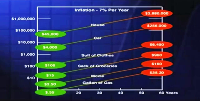 Alcuni anni fa avevo una classe di studenti interessati ai problemi della scienza e della società. Abbiamo passato molto tempo ad imparare a usare la carta millimetrata semilogaritmica, è stampata in modo tale che questi intervalli uguali lungo la scala verticale, rappresentino ognuno un aumento di un fattore 10. Quindi si passa da mille, a diecimila, a centomila, il vantaggio di usare questa carta speciale è che su questa carta una linea retta rappresenta una crescita costante. Abbiamo fatto molti esempi, ho detto agli studenti, “Parliamo di inflazione, parliamo del 7% annuo”. Non era così alta quando l’abbiamo fatto, è stata più alta da allora, fortunatamente è più bassa ora. Ho detto agli studenti, come posso dire a voi, avete circa 60 anni di aspettativa di vita davanti a voi. Vediamo quanto costeranno le cose dopo 60 anni di inflazione annua al 7%. Gli studenti hanno scoperto che un gallone di benzina da $0.55 costerà $35.20, un film da $2.50 costerà $160, il sacco di generi alimentari da $15 – che mia madre comprava a $1.25 – costerà $960, $100 di vestiti costeranno $6400, un’automobile da $4000 costerà un quarto di milione di dollari, una casa da $45000 costerà quasi 3 milioni di dollari.