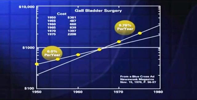 Ho fornito agli studenti questi dati, provenivano da una pubblicità Blue Cross, Blue Shield, la pubblicità appariva sulla rivista Newsweek, e la pubblicità forniva queste cifre per mostrare l’escalation dei costi della chirurgia della cistifellea, negli anni dal 1950, quando quell’operazione costava $361. Ho detto, “Fate un grafico semilogaritmico, vediamo cosa succede”. Gli studenti hanno scoperto che i primi quattro punti erano allineati su una linea retta la cui pendenza indicava un’inflazione di circa il 6% annuo. Ma il quarto, il quinto e il sesto erano su una linea più ripida, quasi il 10% di inflazione annua. Poi ho detto agli studenti, “Proseguite su quella linea più ripida, fino all’anno 2000, facciamoci un’idea di quanto potrebbe costare un intervento chirurgico alla cistifellea”. La risposta è $25000, la lezione è terribilmente chiara, se state pensando a una chirurgia della cistifellea, fatela ora.