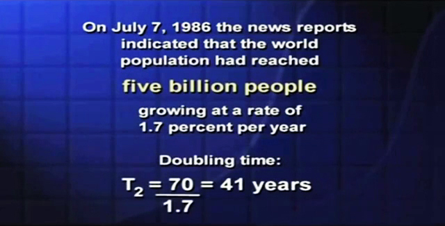 Nell’estate del 1986, i notiziari indicavano che la popolazione mondiale aveva raggiunto il numero di cinque miliardi di persone crescendo al tasso dell’1.7% annuo. La reazione all’1.7% potrebbe essere, “È così piccolo, non può succedere niente di male all’1.7% annuo”. Si calcola il tempo di raddoppio, si scopre che sono solo 41 anni. Più di recente, nel 1999, abbiamo letto che la popolazione mondiale è aumentata da cinque miliardi a sei miliardi di persone. La buona notizia è che il tasso di crescita è sceso dall’1.7% annuo all’1.3% annuo. La cattiva notizia è che, nonostante il calo del tasso di crescita, la popolazione mondiale oggi aumenta di oltre 80 milioni di persone ogni anno.