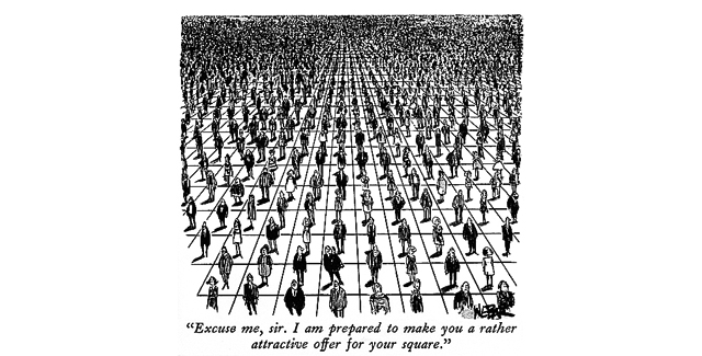 Se questa piccola crescita dell’1.3% annuo continuasse, la popolazione mondiale crescerebbe fino a una densità di una persona per metro quadrato sulla superficie terrestre asciutta in soli 780 anni, e la massa della popolazione sarebbe uguale alla massa della terra in soli 2400 anni. Possiamo sorridere, sappiamo che non può succedere. Questa è una simpatica vignetta, la didascalia dice, “Mi scusi signore, ma sono pronto a farle un’offerta piuttosto interessante per il suo quadrato”. C’è una lezione molto profonda in quella vignetta, la lezione è che ci sarà una crescita della popolazione pari a zero. Possiamo discutere se ci piccia una crescita della popolazione a zero, o non ci piaccia, accadrà che lo discutiamo o no, che ci piaccia o no, è assolutamente certo che le persone non potranno vivere a quella densità sulla superficie terrestre asciutta. Pertanto, gli alti tassi di natalità di oggi diminuiranno, i bassi tassi di mortalità di oggi aumenteranno, finché non avranno esattamente lo stesso valore numerico. Questo succederà certamente prima di 780 anni.