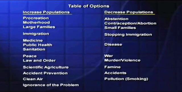 Quindi forse vi starete chiedendo che opzioni sono disponibili se volessimo affrontare il problema. Nella colonna di sinistra, ho elencato alcune delle cose che dovremmo incoraggiare se vogliamo aumentare il tasso di crescita della popolazione, e così facendo peggiorare il problema. Basta guardare la lista, tutto nella lista è sacro come la maternità, c’è l’immigrazione, la medicina, la sanità pubblica, i servizi igienico-sanitari. Sono tutti dedicati all’obiettivo di abbassare il tasso di mortalità, e questo è molto importante per me, se è la mia morte che stanno evitando. Ma bisogna rendersi conto che tutto ciò che abbassa il tasso di mortalità peggiora il problema della popolazione. C’è la pace, la legge e l’ordine. L’agricoltura scientifica ha abbassato il tasso di mortalità dovuto alle carestie, il che non fa che peggiorare il problema della popolazione. Il limite di velocità di 55 miglia orarie ha salvato migliaia di vite, il che peggiora il problema della popolazione. L’aria pulita peggiora le cose. In questa colonna ci sono alcune delle cose che dovremmo incoraggiare se vogliamo abbassare il tasso di crescita della popolazione, e così facendo aiutare a risolvere il problema della popolazione. C’è l’astensione, la contraccezione, l’aborto, piccole famiglie, lo stop all’immigrazione, le malattie, le guerre, gli omicidi, le carestie, gli incidenti. Il fumo aumenta chiaramente il tasso di mortalità, il che aiuta a risolvere il problema.