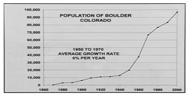 La natura sta già scegliendo dalla lista di destra, avete letto dell’epidemia di AIDS che sta devastando il continente africano. Un amico di ritorno dallo Zimbabwe mi ha detto, “La gente sta morendo per strada”. La natura si sta occupando del problema. Allora da dove cominciamo? Cominciamo da Boulder, in Colorado. Ecco un grafico della popolazione di Boulder, c’è la cifra del censimento degli Stati Uniti del 1950, 1960, 1970. In quel ventennio il tasso di crescita medio della popolazione di Boulder era di circa il 6% annuo, siamo stati in grado di rallentare un po’ la crescita, c’è il dato del censimento del 2000. Mi piace chiedere alla gente, iniziamo con quella cifra del censimento del 2000, andiamo avanti per altri 70 anni – un’altra vita – e chiedo quale tasso di crescita della popolazione di Boulder avremmo bisogno in quei 70 anni, in modo che alla fine dei 70 anni la popolazione di Boulder diventi uguale alla popolazione odierna di una delle principali città americane?