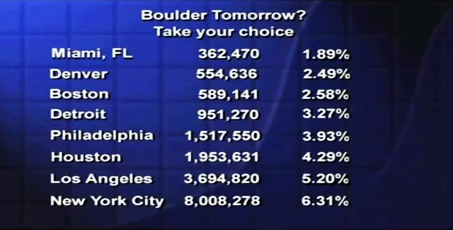Boulder tra 70 anni potrebbe essere grande quanto Boston oggi, se cresceremo del 2.58% annuo. Se pensiamo che Detroit sia un modello migliore, dovremo puntare al 3.27% annuo. Ricordate il dato storico della diapositiva precedente, il 6% annuo? Se ciò potesse continuare per una vita (70 anni), Boulder sarebbe più grande di Los Angeles. Non Boulder più Broomfield, Lewisville, Lafayette, le altre città della contea, solo Boulder. È ovvio che non si potrebbe mettere Los Angeles nella Boulder Valley, quindi è ovvio che la crescita della popolazione di Boulder si fermerà. L’unica domanda è, saremo in grado di fermarla finché c’è ancora un po’ di spazio disponibile, o aspetteremo fino a quando non ci sarà una sovrappopolazione muro-contro-muro e moriremo tutti soffocati?