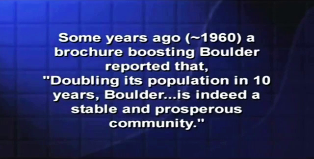 È interessante leggere cosa dicono i sostenitori. Alcuni anni fa abbiamo letto che raddoppiando la sua popolazione in 10 anni Boulder è una comunità davvero stabile. Di cosa stanno parlando? Stiamo viaggiando a 100 miglia all’ora, 7% di crescita annua, raddoppiando in meno di 10 anni, e qualcuno fa l’affermazione idiota che siamo stabili, stiamo fermi, non ci muoviamo? Non capiscono nemmeno il significato delle parole che mettono su carta. Ogni tanto qualcuno dice, “Ma sai, una città più grande potrebbe essere una città migliore”, e io rispondo, “Aspetta un attimo, abbiamo già fatto quell’esperimento!”. Non abbiamo bisogno di chiederci quale sarà l’effetto della crescita su Boulder, perché Boulder domani può essere visto a Los Angeles oggi, al prezzo di un biglietto aereo, possiamo fare un salto di 70 anni nel futuro, e vedere esattamente cosa sarà. Come sarà? C’è una notizia interessante da Los Angeles, “I livelli di agenti cancerogeni nell’aria sono 426 volte superiori allo standard federale”. Quel titolo probabilmente c’entra qualcosa con questo titolo, “Lo smog uccide 1600 persone all’anno nell’area di Los Angeles”.