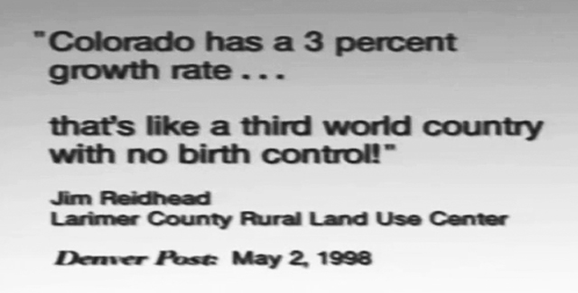 Come siamo messi in Colorado? Il Denver Post ci dice che siamo la capitale della crescita degli Stati Uniti e ne siamo orgogliosi. Il Rocky Mountain News ci dice di aspettarci un altro milione di persone nel Front Range nei prossimi 20 anni. Nel Denver Post c’era una storia interessante, qualcuno ha detto che il Colorado ha un tasso di crescita del 3%, che è come quello di un paese del terzo mondo senza controllo delle nascite. Inviamo aiuti esteri, assistenza per la pianificazione familiare a paesi che hanno tassi di crescita della popolazione inferiori a quelli del Colorado. Come si può immaginare, il controllo della crescita è molto controverso, e faccio tesoro della lettera da cui sono tratte queste citazioni. Questa lettera mi è stata scritta da un cittadino di spicco di questa comunità, uno dei principali sostenitori della “Crescita controllata”. “Crescita controllata” significa semplicemente “Crescita”. Quest’uomo scrive, “Non ho obiezioni ai tuoi argomenti sulla crescita esponenziale, […] non credo che l’argomento esponenziale sia valido a livello locale”. Vedete, l’aritmetica non funziona a Boulder. Devo ammettere che quest’uomo si è laureato all’Università del Colorado, non una laurea in matematica, scienze o ingegneria.