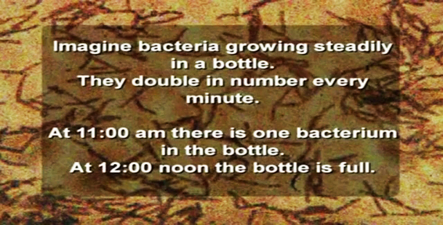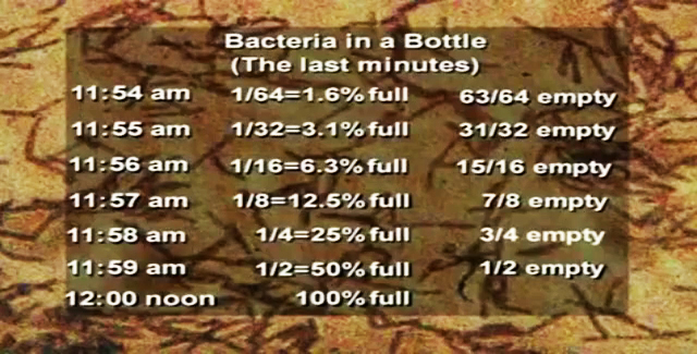 (2) Se tu fossi un batterio in quella bottiglia, a che ora ti renderesti conto per la prima volta che stai esaurendo lo spazio? Pensateci, questo tipo di crescita costante è il fulcro dell’economia nazionale, e dell’intera economia globale, pensateci. Diamo un’occhiata agli ultimi minuti nella bottiglia. Alle 12:00 è piena, un minuto prima è mezza piena, 2 minuti prima è piena a un quarto, poi a un ottavo, poi a un sedicesimo. Chiedetevi, a cinque minuti prima delle 12:00, quando la bottiglia è piena solo al 3% ed è vuota al 97%, con ottime prospettive di sviluppo, quanti di voi si renderebbero conto che c’è un problema?