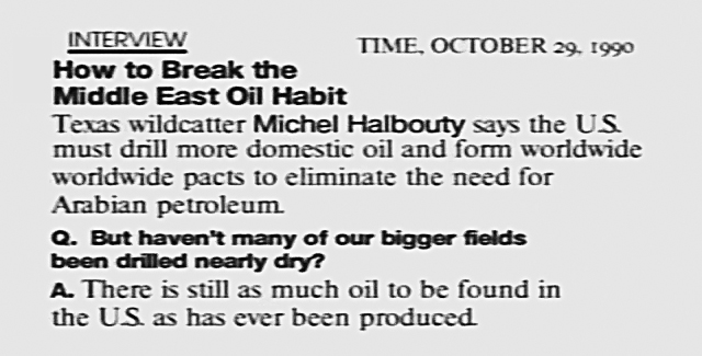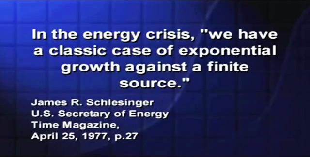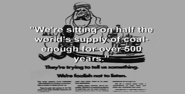 È interessante leggere cosa dicono gli esperti. Ecco un’intervista sulla rivista Time, con uno degli esperti di petrolio più quotati in tutto il Texas, gli hanno chiesto, “Non abbiamo esaurito molti dei nostri più grandi giacimenti?”. Risponde dicendo, “C’è ancora tanto petrolio da trovare negli Stati Uniti di quanto ne sia mai stato prodotto”. Supponiamo che abbia ragione. Che ore sono? La risposta è, che è un minuto prima delle 12:00. Ho letto diverse cose scritte da questo signore, non credo che abbia la minima comprensione di questa semplicissima aritmetica. Durante la crisi degli anni settanta apparivano annunci come questo, questo è dell’American Electric Power Company. È abbastanza rassicurante, come a dire non preoccupatevi troppo, “Perché siamo seduti su metà della riserva mondiale di carbone, abbastanza per oltre 500 anni”. Da dove viene quella cifra di “500 anni”? Potrebbe aver avuto origine da questo rapporto alla commissione per gli Affari interni e insulari del Senato degli Stati Uniti, perché in quel rapporto troviamo questa frase, “Agli attuali livelli di produzione e estrazione, le riserve di carbone americane dureranno più di 500 anni”. È una delle affermazioni più pericolose mai scritte.