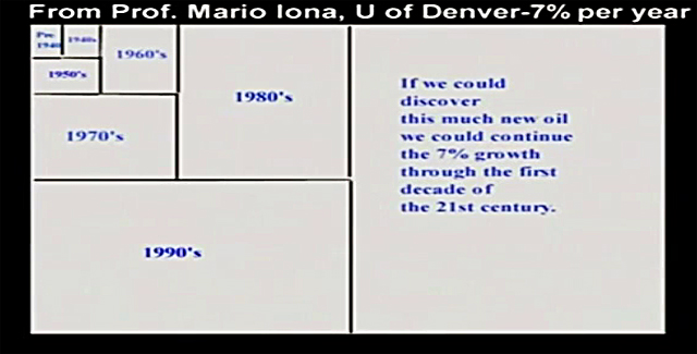Vediamolo in una rappresentazione grafica molto chiara. Supponiamo che l’area di questo minuscolo rettangolo rappresenti tutto il petrolio che abbiamo consumato su questa terra prima del 1940. Poi negli anni ’40 ne abbiamo consumata questa quantità, che è uguale al totale di tutto ciò che è stato consumato in tutta la storia. Nel decennio degli anni ’50 ne abbiamo consumata questa quantità, che è uguale al totale di tutto ciò che è stato consumato in tutta la storia. Nel decennio degli anni ’60 ne abbiamo consumata questa quantità, e ancora una volta è uguale al totale di tutto il consumo precedente. Vediamo graficamente quello che ci ha detto il Presidente Carter, se quel 7% fosse continuato negli anni ’70, ’80 e ’90, ce ne sarebbe a sufficienza, ma sarebbe tutto il petrolio esistente. C’è una convinzione diffusa che se investi abbastanza soldi nella trivellazione, il petrolio sicuramente uscirà. Ci saranno scoperte di nuovo petrolio, potrebbero esserci scoperte importanti, ma dobbiamo scoprire questa quantità di nuovo petrolio se vogliamo che la crescita del 7% continui per altri 10 anni. Chieditevi, qual è la possibilità che il petrolio scoperto dopo la fine della nostra lezione di oggi sia in quantità pari al totale di tutto ciò che abbiamo conosciuto in tutta la storia? E rendetevi conto che se tutto quel nuovo petrolio potesse essere trovato, sarebbe sufficiente per far continuare la crescita storica del 7% per altri 10 anni.