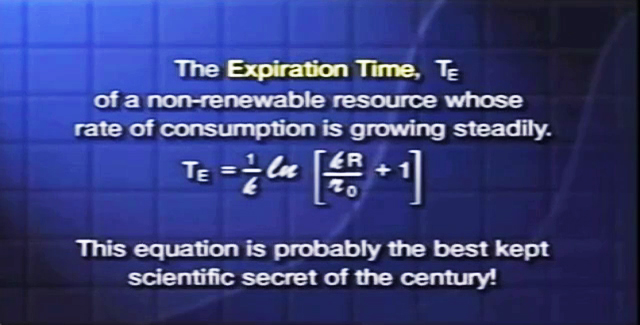 Ecco l’equazione per il tempo di esaurimento, bastano le nozioni del primo anno di calcolo al college per ricavare questa equazione, non può essere molto difficile, ho la sensazione che ci debbano essere dozzine di persone in questo paese che hanno studiato il primo anno di calcolo al college. Penso che questa equazione sia probabilmente il segreto scientifico meglio custodito del secolo, vi mostrerò il perché. Se si usa questa equazione per calcolare l’aspettativa di durata della base di riserva, o della metà della base di riserva che si stima sia estraibile, per diversi tassi di crescita costanti, si trova che se il tasso di crescita è zero, la stima minima sarebbe di circa 240 anni, quella massima si avvicinerebbe ai 500 anni. Quel rapporto al Congresso era corretto, ma guardate cosa otteniamo quando aggiungiamo una crescita costante. Negli anni ’70, avevamo l’obiettivo nazionale di raggiungere un tasso di crescita dell’8% annuo nella produzione di carbone negli Stati Uniti, se ciò fosse stato possibile e protratto nel tempo il carbone durererebbe tra i 37 e i 46 anni. Il Presidente Carter ha ridotto questo obiettivo all’incirca della metà, sperando di raggiungere il 4% annuo, se ciò potesse continuare, il carbone durerebbe tra i 59 e i 75 anni. Ecco quel 2.86% che abbiamo appena visto come media negli ultimi vent’anni, se potesse continuare, il carbone si esaurirebbe tra i 72 ei 94 anni. Questo rientra nell’aspettativa di vita dei bambini nati oggi.