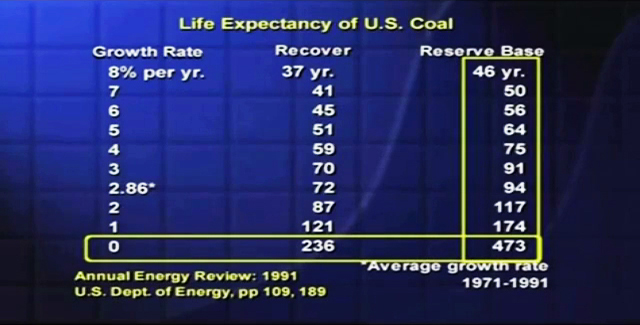 È pericolosa perché è vera, ma non è la verità a renderla pericolosa, il pericolo sta nel fatto che le persone estraggono la frase dal contesto, ripetono solo che il carbone durerà 500 anni. Dimenticano l’avvertimento con cui è iniziata la frase. Quali erano le parole di apertura? “Ai livelli attuali”. Che cosa significa? Significa se – e solo se – manteniamo una crescita zero della produzione di carbone in questo paese. Diamo un’occhiata a qualche cifra. Prendiamo l’Annual Energy Review pubblicato dal Dipartimento dell’Energia degli Stati Uniti, danno questa cifra come base di riserva dimostrata di carbone (57 miliardi di tonnellate), c’è una nota a piè di pagina che dice, “Si stima che circa la metà della base di riserva dimostrata sia estraibile”. Non si può estrarre e utilizzare il 100% del carbone che c’è nel sottosuolo, questo numero (24 miliardi di tonnellate) è la metà di questo numero, e ci torneremo tra un momento. Il rapporto dice anche che nell’anno 1971 stavamo estraendo carbone in questo paese a questo ritmo (0.56 miliardi di tonnellate), vent’anni dopo, nel 1991, stavamo estraendo a questo ritmo (0.99 miliardi di tonnellate). Mettendo insieme questi numeri, il tasso di crescita medio della produzione di carbone in quei vent’anni è stato del 2.86% annuo. Dobbiamo chiederci, quanto tempo potrebbe durare una risorsa se avessimo una crescita costante del tasso di consumo fino a quando non viene esaurita?